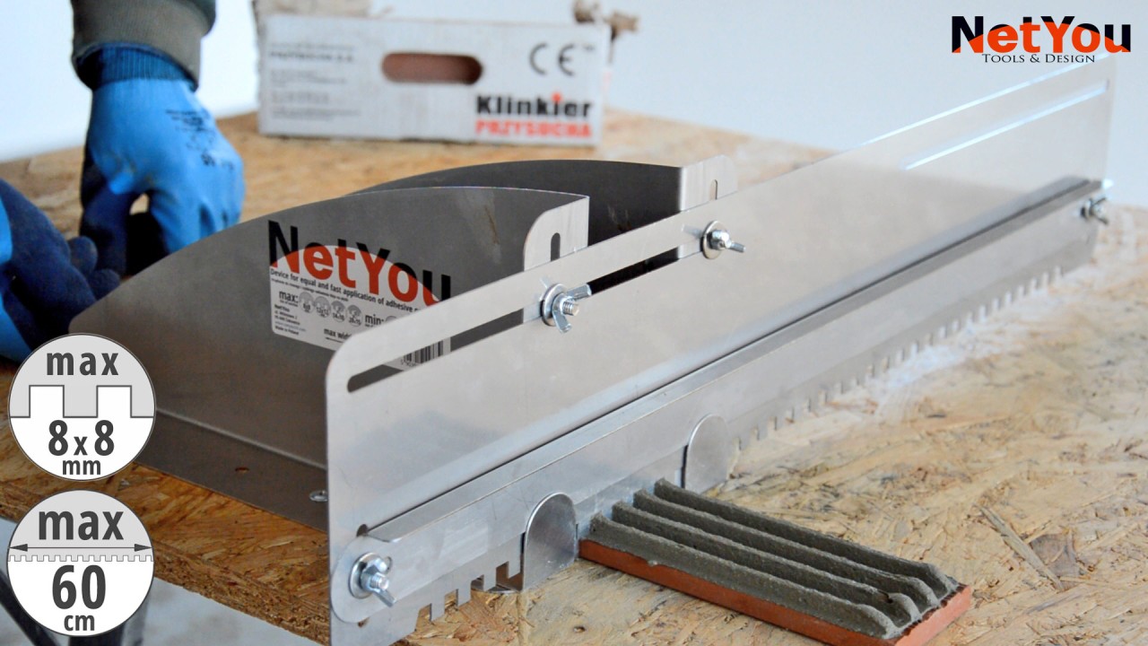 NetYou II es una herramienta - una llana dentada, fácil de limpiar, especialmente diseñada para un transporte seguro - todos los bordes son redondeados, excepto las muescas. La construcción del dispositivo es duradera y resistente, lo que permite su uso no sólo en baldosas de cerámica, sino también en piedra, gres, parquet, poliestireno, poliestireno extruido (XPS) y muchos otros materiales. Nuestros dispositivos permiten una aplicación de adhesivo sobre baldosas mucho más rápida que los métodos tradicionales. ¡Ahora es posible cubrir 100 m² en un día!