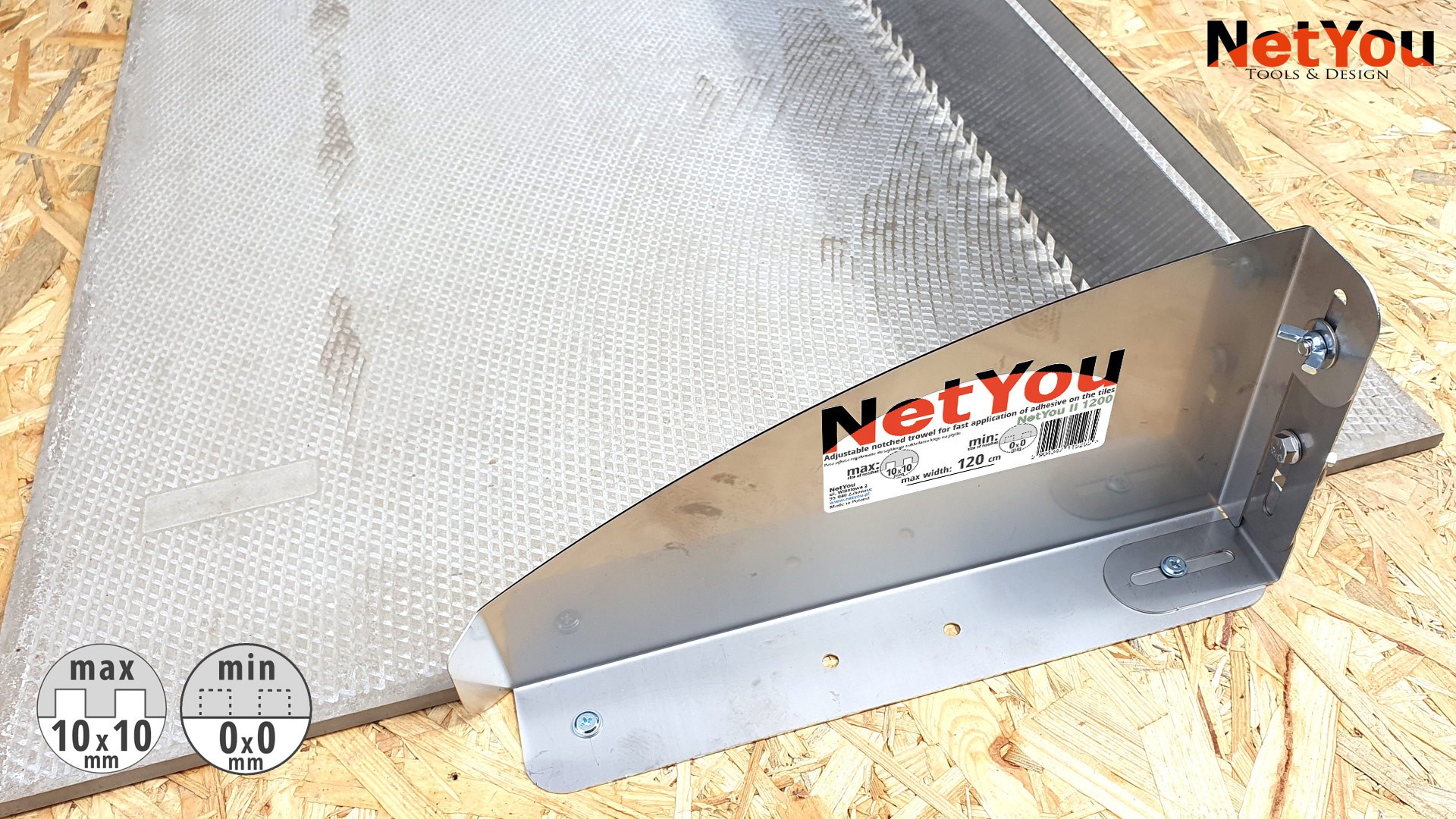 Если наносим клей на плитку «ровно» — опуститепланку жесткости гребенки (помните о зазоре в 1 мм над плиткой).